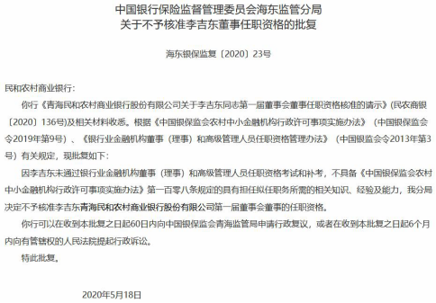 公告显示,因李吉东未通过银行业金融机构董事(理事)和高级管理人员任职资格考试和补考,不具备《中国银保监会农村中小金融机构行政许可事项实施办法》第一百零八条规定的具有担任拟任职务所需的相关知识、经验及能力,不予核准其民和农商银行第一届董事会董事的任职资格。