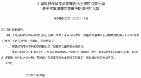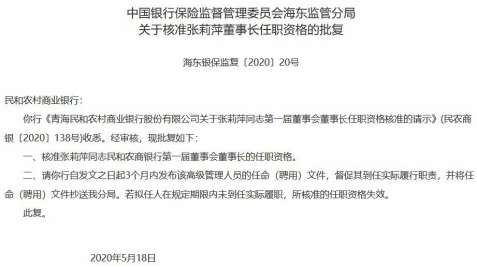 批复显示,海东银保监分局根据相关规定,核准张莉萍民和农商银行第一届董事会董事、董事长任职资格。