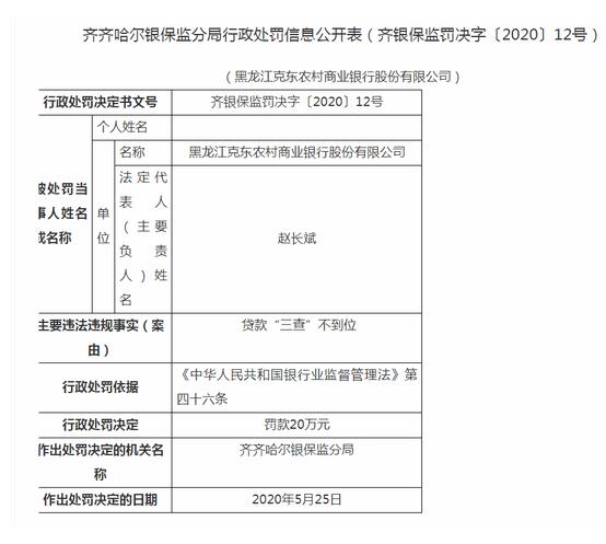新浪财经讯 6月2日消息,齐齐哈尔银保监分局公布行政处罚决定书显示,黑龙江克东农村商业银行股份有限公司因存在 贷款“三查”不到位的行为,被罚款20万元。