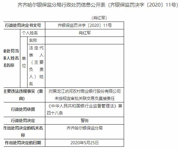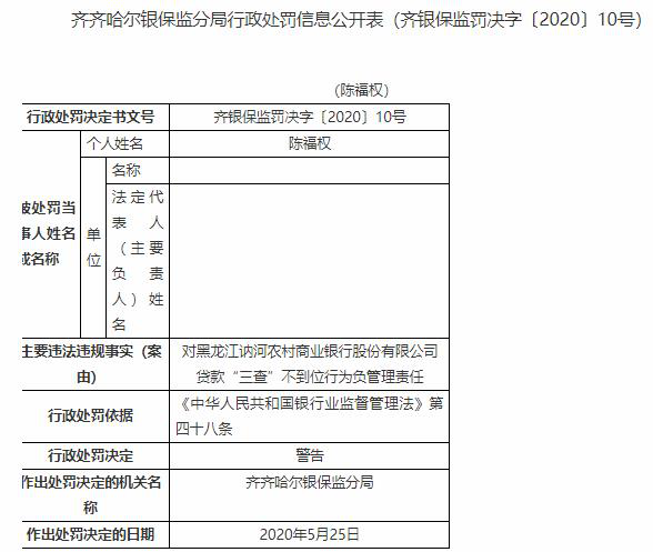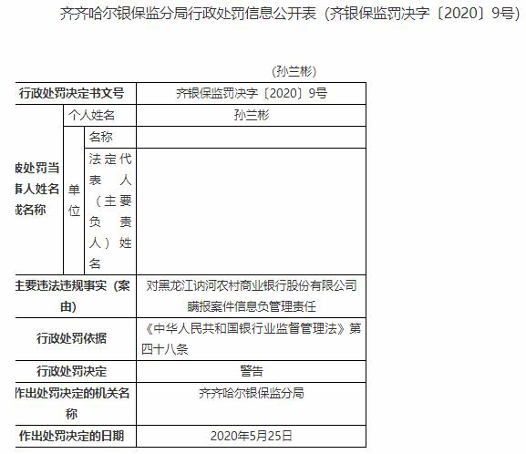 孙兰彬对黑龙江讷河农商行瞒报案件信息负管理责任;陈福权对黑龙江讷河农商行贷款“三查”不到位行为负管理责任;肖红军对黑龙江讷河农商行未按规定审批关联交易负直接责任。依据《中华人民共和国银行业监督管理法》第四十八条,齐齐哈尔银保监分局对孙兰彬、陈福权、肖红军给以警告。