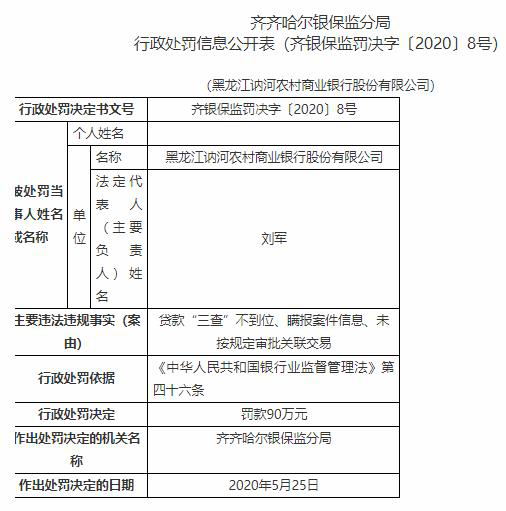 中国经济网北京6月3日讯 中国银保监会网站昨日公布的齐齐哈尔银保监分局行政处罚信息公开表(齐银保监罚决字〔2020〕8号、9号、10号、11号、17号)显示,黑龙江讷河农村商业银行股份有限公司(简称“黑龙江讷河农商行”)存在贷款“三查”不到位、瞒报案件信息、未按规定审批关联交易的违法违规行为,依据《中华人民共和国银行业监督管理法》第四十六条,齐齐哈尔银保监分局对银行罚款90万元。