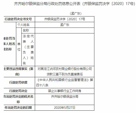 此外,孟广东对黑龙江讷河农商行贷款三查不到为负直接责任。依据《中华人民共和国银行业监督管理法》第四十八条,齐齐哈尔银保监分局对孟广东作出禁止从事银行业工作终身的行政处罚决定。