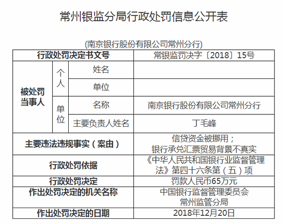 新浪财经讯 6月4日消息,常州银监分局公布行政处罚信息公开表,南京银行股份有限公司常州分行因存在信贷资金被挪用、银行承兑汇票贸易背景不真实的违规行为,被罚款人民币65万元。