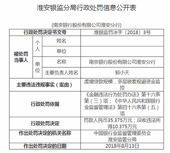 新浪财经讯 6月4日消息,淮安银监分局公布行政处罚信息公开表,南京银行股份有限公司淮安分行因存在虚增贷款规模,多层嵌套规避资金监控的违规行为,被罚款人民币35.375万元;没收违法所得10.375万元。