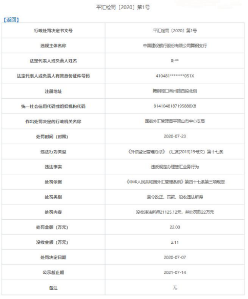 中国经济网北京7月15日讯 国家外汇管理局河南省分局网站今日公布的外汇行政处罚信息表(平汇检罚〔2020〕第1号)显示,中国建设银行股份有限公司(简称“建设银行”,601939.SH)舞钢支行违反规定办理售汇业务。上述行为违反了《外债登记管理办法》(汇发[2013]19号文)第十七条。依据《中华人民共和国外汇管理条例》第四十七条第三项规定,国家外汇管理局平顶山市中心支局决定对该支行处以责令改正、没收违法所得2.11万元,并处罚款22万元。