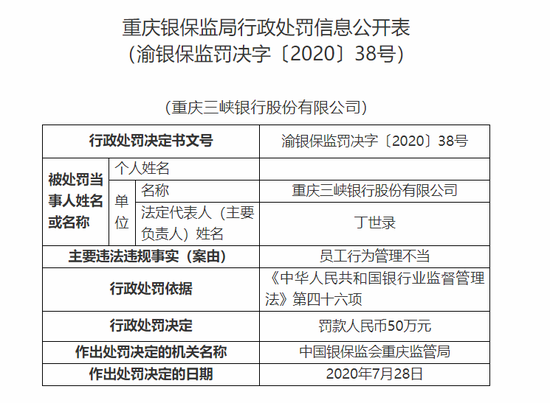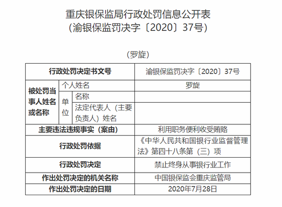新浪财经8月3日消息,重庆银保监局公布的行政处罚信息公开表显示,重庆三峡银行股份有限公司因员工行为管理不当,被处罚款50万元。同时,相关责任人罗旋因利用职务便利收受贿赂,被终身禁止从事银行业工作。