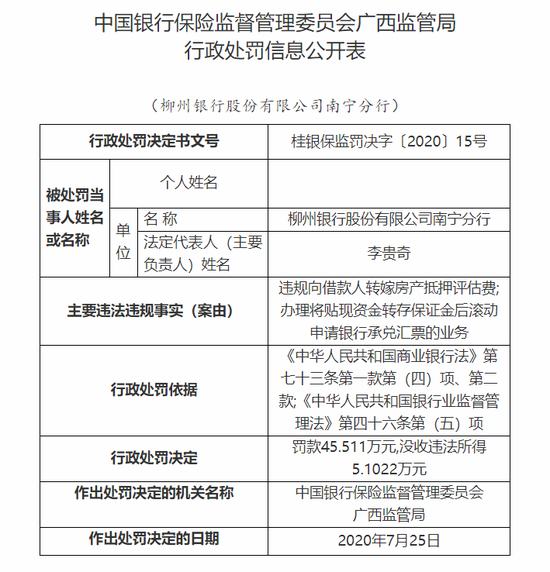 新浪财经8月5日消息,广西银保监局公布的行政处罚信息公开表显示,柳州银行股份有限公司南宁分行因违规向借款人转嫁房产抵押评估费;办理将贴现资金转存保证金后滚动申请银行承兑汇票的业务,被处罚款45.511万元并没收违法所得5.1022万元。