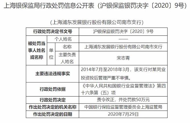 中国经济网北京8月6日讯 银保监网站昨日公布的上海银保监局行政处罚信息公开表(沪银保监银罚决字〔2020〕9号)显示,上海浦东发展银行股份有限公司(简称“浦发银行”,600000.SH)南市支行存在以下违法违规事实:2014年7月至2018年3月,该支行对某同业投资投后管理严重不审慎。依据《中华人民共和国银行业监督管理法》第四十六条第(五)项,上海监管局对该支行责令改正,并处罚款50万元。