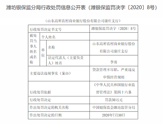 新浪财经8月10日消息,潍坊银保监分局公布的行政处罚信息公开表显示,山东高密农村商业银行股份有限公司康庄支行因贷款管理不尽职,严重违反审慎经营规则,被处罚款50万元。