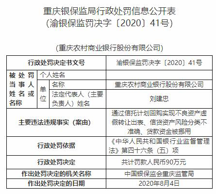 中国经济网北京8月11日讯 重庆银保监局行政处罚信息公开表(渝银保监罚决字〔2020〕41号)显示,重庆农村商业银行股份有限公司(简称“渝农商行”,601077.SH)存在以下3宗违法违规事实:通过信托计划回购实现不良资产虚假转让出表、信贷资产风险分类不准确、贷款资金被挪用。依据《中华人民共和国银行业监督管理法》第四十六条(五)项,重庆银保监局对其共计处罚款人民币90万元。