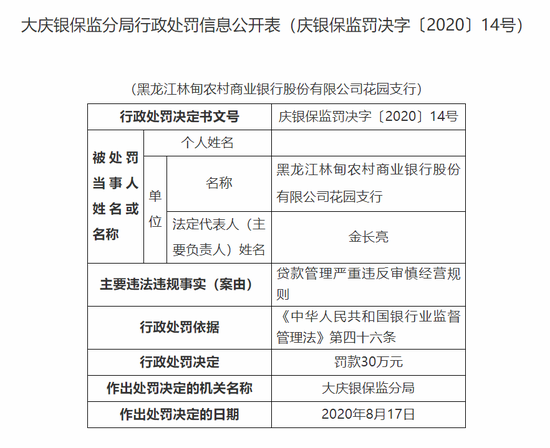 新浪财经8月19日消息,大庆银保监分局公布的行政处罚信息公开表显示,黑龙江林甸农村商业银行股份有限公司花园支行因贷款管理严重违反审慎经营规则,被处罚款30万元。