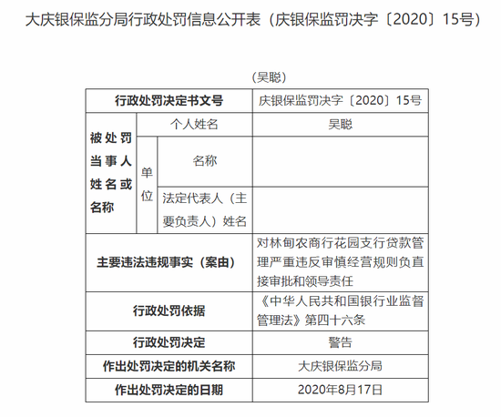 此外,相关责任人吴聪对林甸农商行花园支行贷款管理严重违反审慎经营规则负直接审批和领导责任,受到警告处分。