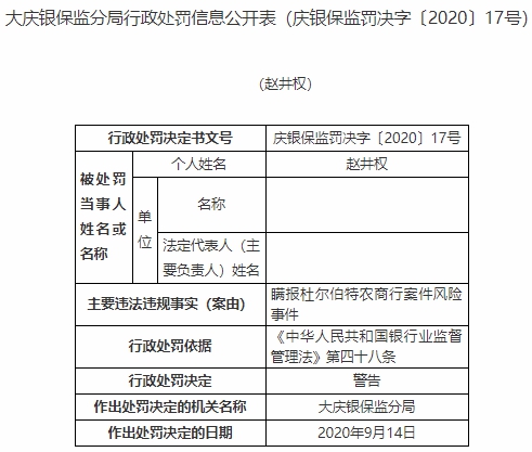 行政处罚信息公开表(庆银保监罚决字〔2020〕17号)显示,赵井权瞒报杜尔伯特农商行案件风险事件。依据《中华人民共和国银行业监督管理法》第四十八条,大庆银保监分局对赵井权处以警告。