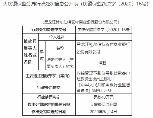 中国经济网北京9月16日讯 银保监网站昨日公布的大庆银保监分局行政处罚信息公开表(庆银保监罚决字〔2020〕16号)显示,黑龙江杜尔伯特农村商业银行股份有限公司(简称“杜尔伯特农商行”)存在内控管理不到位导致贷款客户还款资金被员工挪用的违法违规事实。依据《中华人民共和国银行业监督管理法》第四十六条,大庆银保监分局对该行处以罚款40万元。