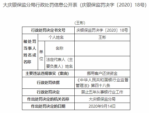 行政处罚信息公开表(庆银保监罚决字〔2020〕18号)显示,王彬挪用客户还贷资金。依据《中华人民共和国银行业监督管理法》第四十八条,大庆银保监分局对王彬作出禁止五年从事银行业工作的行政处罚。
