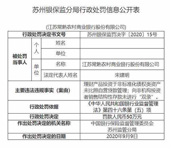新浪财经9月17日消息,苏州银保监分局公布的行政处罚信息公开表显示,江苏常熟农村商业银行股份有限公司因理财产品投资于非标准化债权类资产未比照自营贷款管理;向非机构投资者销售结构性存款未进行“双录”,被处罚款50万元。