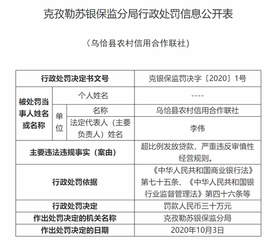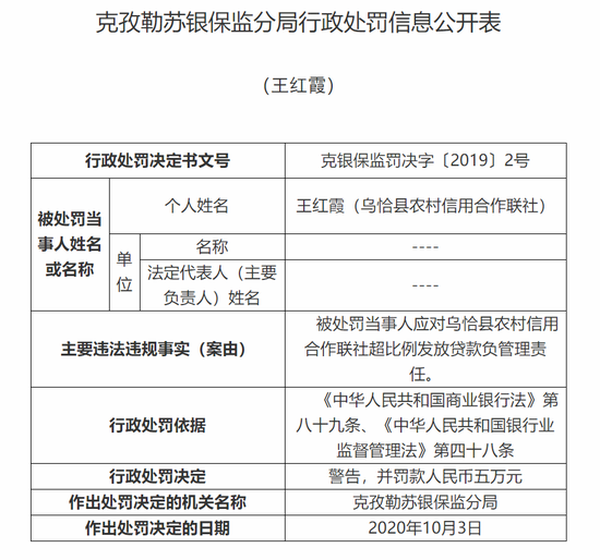 10月15日消息,克孜勒苏银保监分局公布的行政处罚信息公开表显示,乌恰县农村信用合作联社因超比例发放贷款,严重违反审慎性经营规则,被处罚款30万元。同时,相关责任人王红霞对乌恰县农村信用合作联社超比例发放贷款负管理责任,受到警告处分并被罚款5万元。