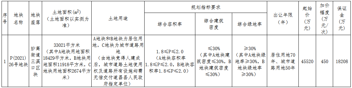 资料显示,该地块编号为遂自然资规告字〔2021〕019号,位于妙高街道三溪口区块。出让面积3.04万平,起始价4.55亿元,竞买保证金1.82亿元,建筑密度≤30%,绿地率≥30%。