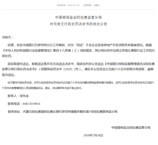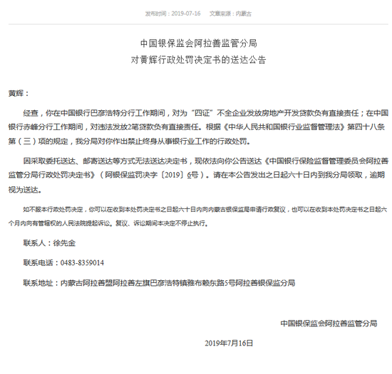 新浪财经讯 7月16日消息,中国银保监会阿拉善监管分局今日公布两张行政处罚决定书的送达公告。中国银行巴彦浩特分行员工黄辉、司俊文,均因“对为‘四证’不全企业发放房地产开发贷款负有直接责任”,被监管禁止终身从事银行业工作的行政处罚。此外,黄辉还对在中国银行赤峰分行工作期间,违法发放2笔贷款负有直接责任。