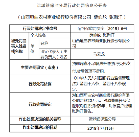运城银保监分局决定对山西垣曲农村商业银行股份有限公司罚款20万元。对原董事长薛仰舵取消任职资格5年,对原客户经理张海江警告。