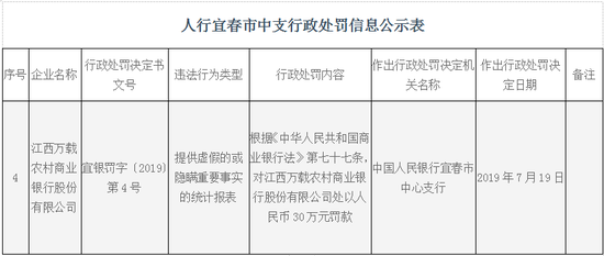 新浪财经讯 7月26日消息,中国人民银行网站近日公布的中国人民银行宜春市中支行政处罚信息公示表(宜银罚字〔2019〕第4号)显示,江西万载农村商业银行股份有限公司存在提供虚假的或隐瞒重要事实的统计报表的违法行为。根据《中华人民共和国商业银行法》第七十七条的规定,中国人民银行宜春市中心支行对江西万载农村商业银行股份有限公司处以人民币30万元罚款。