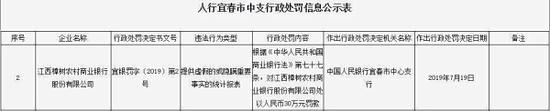 新浪财经讯 7月26日消息, 中国人民银行南昌中心支行近日公布的人行宜春市中支行政处罚信息公示表(宜银罚字〔2019〕第2号)显示,江西樟树农村商业银行股份有限公司存在提供虚假的或隐瞒重要事实的统计报表的违法违规行为。根据《中华人民共和国商业银行法》第七十七条,中国人民银行宜春市中心支行对其处以人民币30万元罚款。