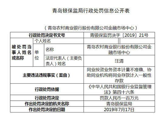 青岛农村商业银行股份有限公司金融市场中心因存在同业投资业务资本计量不准确、协助同业机构将同业存款计入一般性存款的行为,被青岛银保监局罚款人民币100万元。