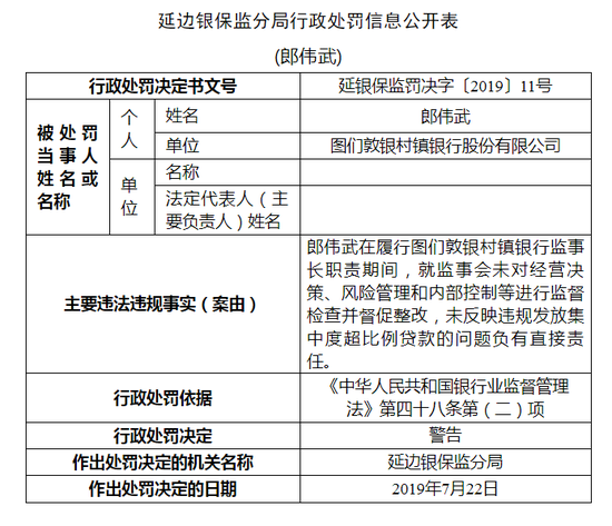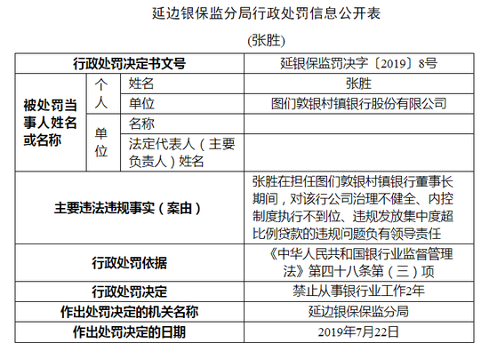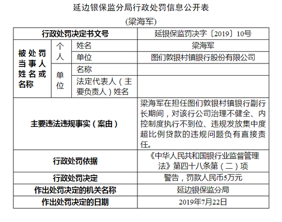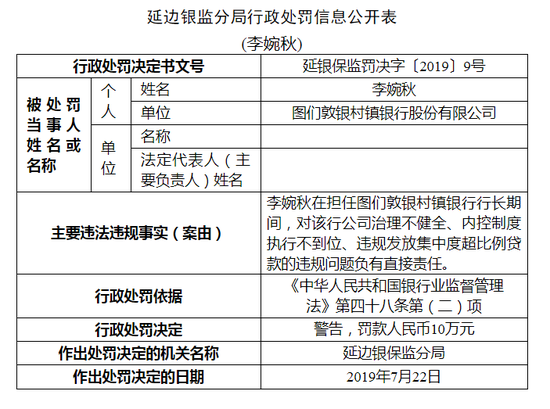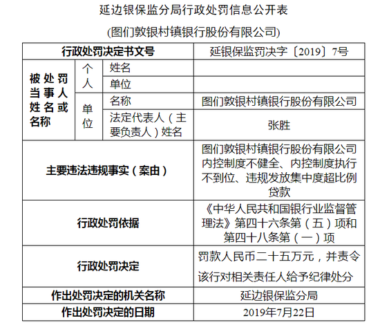 新浪财经讯 7月30日消息,延边银保监分局近日公布关于图们敦银村镇银行股份有限公司的行政处罚信息公开表。