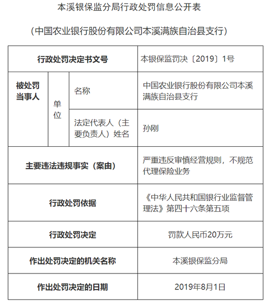 新浪财经讯 8月12日消息,本溪银保监分局近日发布行政处罚信息公开表显示,农行本溪满族自治县因严重违反审慎经营规则,不规范代理保险业务,被罚款20万元。