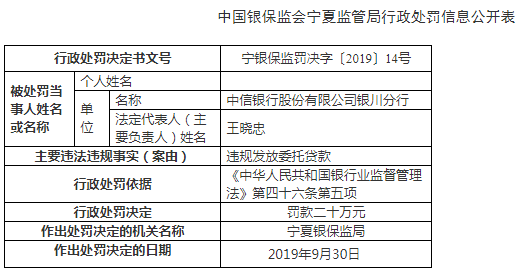 中国经济网北京10月11日讯 银保监会网站今日公布的行政处罚信息公开表(宁银保监罚决字〔2019〕14号)显示,中信银行股份有限公司银川分行违规发放委托贷款。依据《中华人民共和国银行业监督管理法》第四十六条第五项,宁夏银保监局对其罚款二十万元。