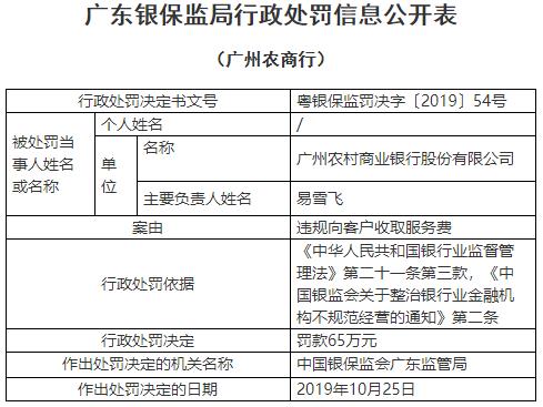 中国经济网北京10月31日讯 银保监会网站今日公布的广东银保监局行政处罚信息公开表(粤银保监罚决字〔2019〕54号)显示,广州农村商业银行股份有限公司存在违规向客户收取服务费的行为。根据《中华人民共和国银行业监督管理法》第二十一条第三款,《中国银监会关于整治银行业金融机构不规范经营的通知》第二条,中国银保监会广东监管局对其处以罚款65万元。