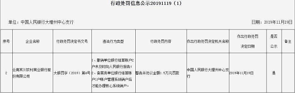 中国经济网北京11月26日讯 中国人民银行昆明中心支行近日公布的行政处罚信息公示表(大银罚字〔2019〕第4号)显示,云南宾川农村商业银行股份有限公司存在撤销单位银行结算账户2户未及时向人民银行报告;备案类单位银行结算账户1户账户管理系统销户后才能办理核心系统销户两宗违法违规行为。中国人民银行大理州中心支行对其警告并处以金额1.5万元罚款。
