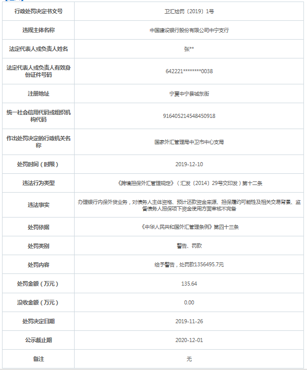 2019年11月26日,国家外汇管理局中卫市中心支局依据《中华人民共和国外汇管理条例》第四十三条,对建设银行中宁支行给予警告,处罚款1356495.7元。