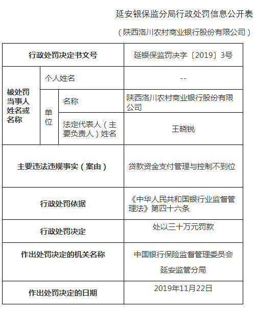 中国经济网北京12月18日讯 银保监会网站近日公布的行政处罚决定书(延银保监罚决字〔2019〕3号)显示,陕西洛川农村商业银行股份有限公司贷款资金支付管理与控制不到位。依据《中华人民共和国银行业监督管理法》第四十六条,中国银行保险监督管理委员会延安监管分局对公司处以三十万元罚款。