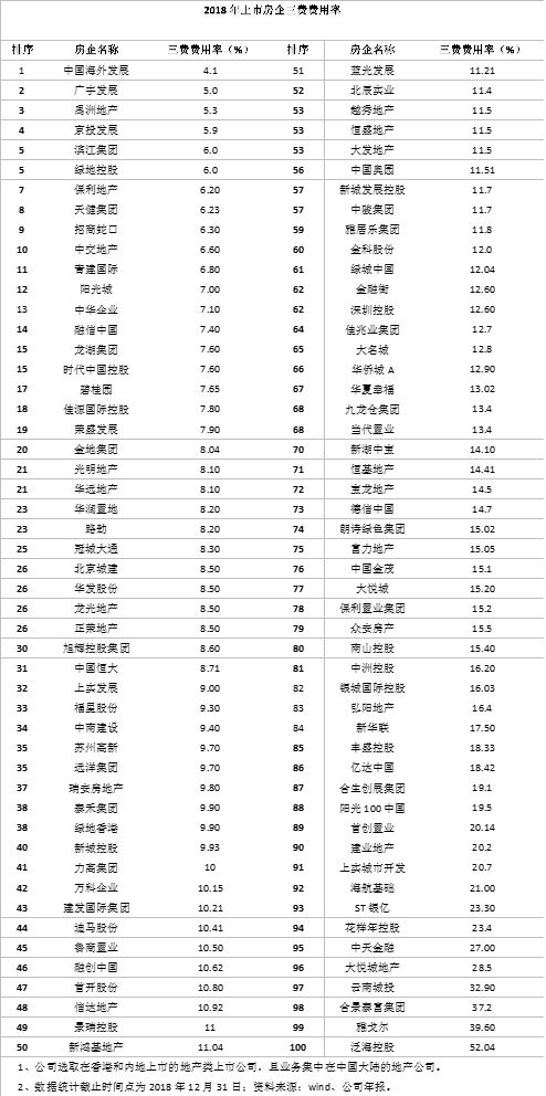 通过wind数据、企业财务报告,中国网地产选取2018年总营业收入在50亿以上,且主营地产业务主要在内地的A股和港股上市房企,剔除数据重复和数据不全的上市房企,形成最终的100家房企三费费用率样本。