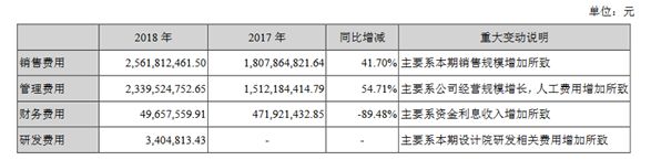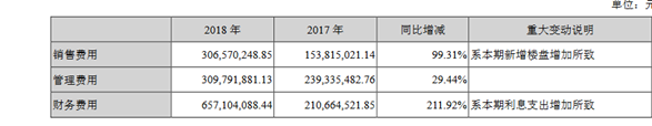 同样,位列前十名之列,2019年以来,不断“买买买”、并被“踢出”上证50样本股的绿地,2018年6%的三费费用率,较之于2017年5.15%,也高了将近1个百分点。数据显示,绿地2018年营业总收入为3487.32亿元,销售费用、管理费用、财务费用分别占比2.12%、2.71%、1.16%。其中,财务费用变动幅度最大,与去年同期相比,增长幅度高达158.36%。