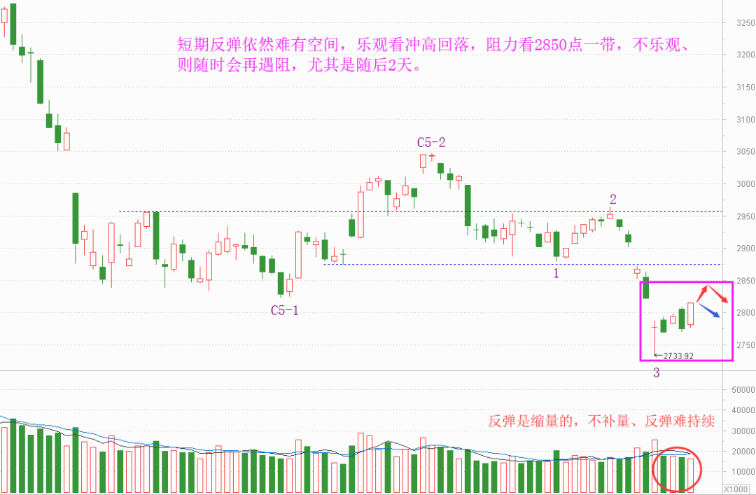 技术上,大盘暂站上了年线,而且还是阳包阴的形态,只是,量能仍是绕不开的坎,接下来必须补量、才能维持住短期的反弹,否则,随时随地都将再遇阻回落,因为短期反弹的极限是5-7个交易日,而周二、周三正对着2733点开始的第6、7个交易日。而接下来能出现补量吗?感觉有些难,具体还需一步步看。空间上,缺口压力还差一点,再往上的强阻力就是2850点一带了,预计短期向上仍难乐观;至于支撑,可先看2790点,一旦再失守,需谨防二次探底了。