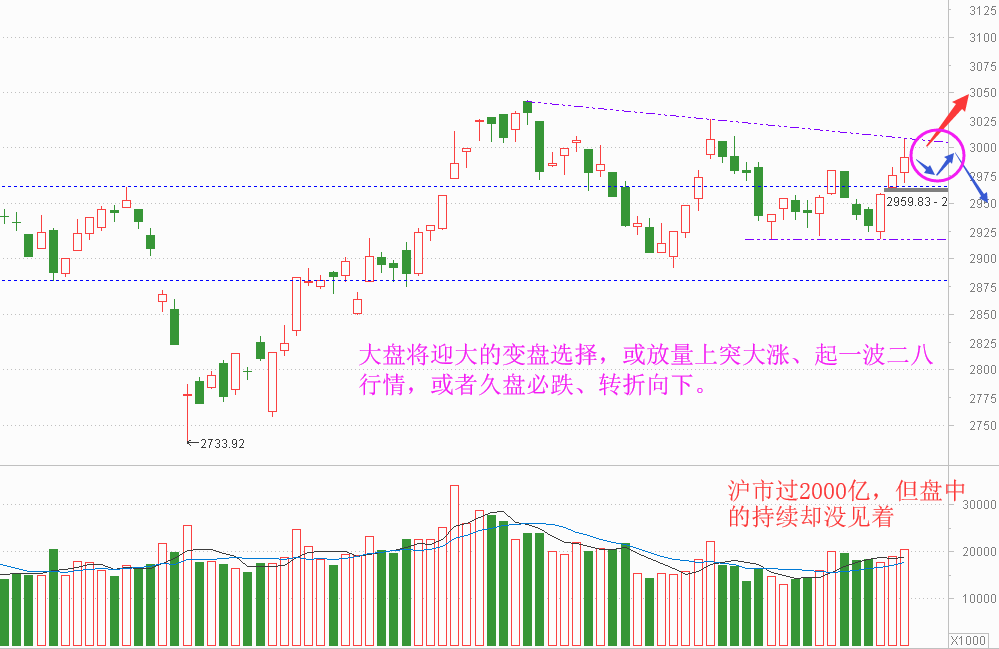 并且,周二冲至的高点3008点、正好是在3042-3026点的下降趋势线处遇阻的,这意味着,技术上也将面临着变盘的选择: