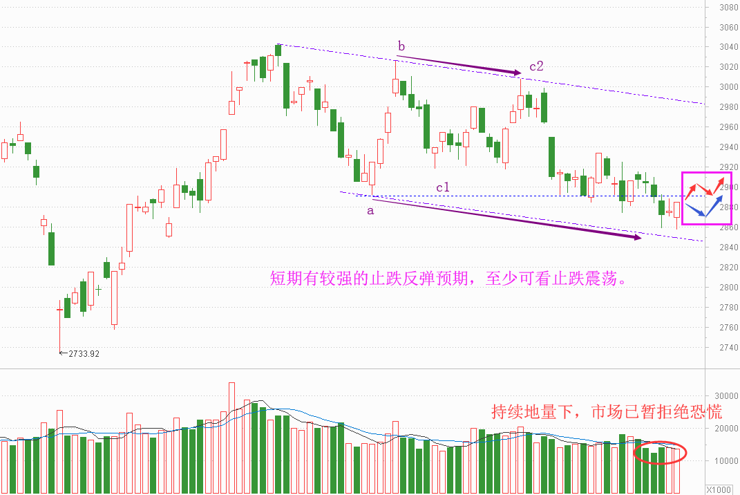 2、再回顾下这几天的行情吧。上周五,大盘创了调整新低,尤其是2858点止跌前、形态是比较难看的,但是却见不着杀恐慌的动作;周一,在有周末利好的情况下,却走了一个冲高回落,下午2点后翻绿后、是容易跳水的,可依然见不着恐慌;周一晚上美股大跌,对周二形成不利预期,而周三却依然见不着恐慌,早盘就没有。