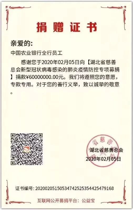 【抗击疫情,中国银行业在行动!】中国金融网跟踪报道系列(60):农业银行员工向湖北捐赠6000万元用于抗击新冠肺炎疫情