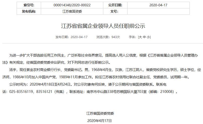 公告显示,汤宇,现任紫金农村商业银行行长、党委副书记。男,1968年4月生,汉族,江苏江阴人,省委党校研究生学历,硕士学位,经济师,1986年10月加入中国共产党,1989年11月参加工作。拟任江苏省农村信用社联合社副主任、党委委员,试用期一年。